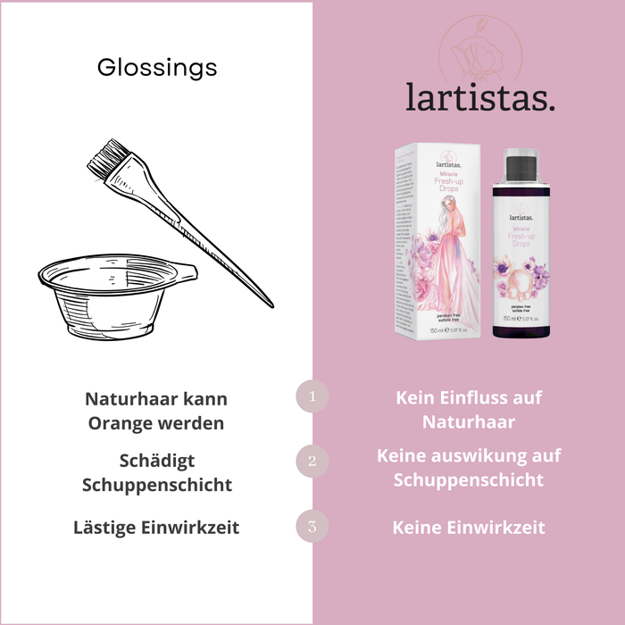 Die Miracle Fresh Up Drops sind definitiv die bessere Wahl. Im Vergleich zu herkömmlichen Abmattierungsmethoden erkennt man auf den ersten Blick die überlegene Wirkung. Die Fresh Up Drops sind ein unverzichtbares Produkt für jeden Blond-Haushalt.